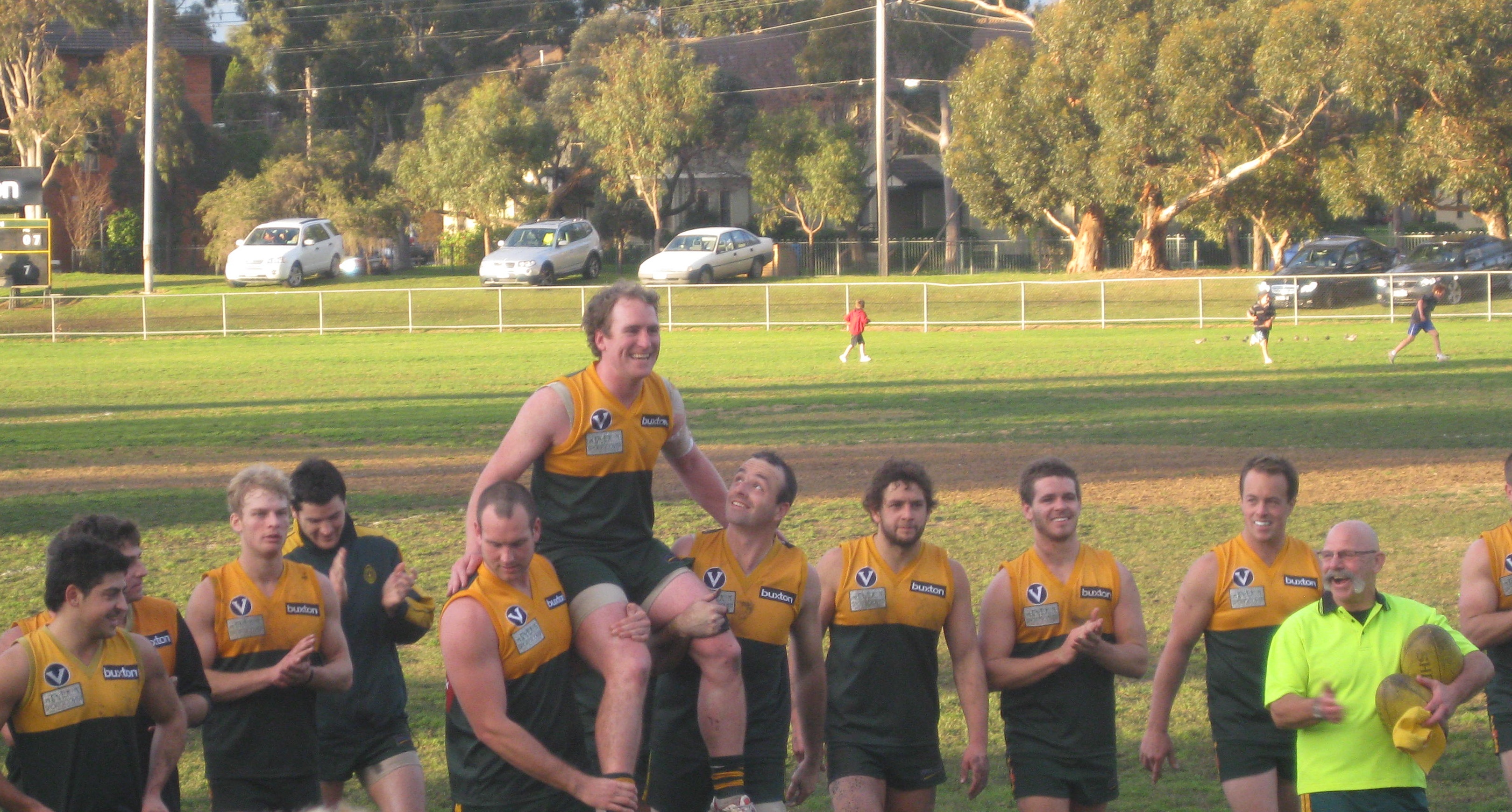 My 200th VAFA game with Hampton Rovers on 3rd July was one of my biggest sporting moments. My family and friends came to watch me play (including my dog Oskar in his own footy jumper made by my mum), and after the match my team-mates carried me off the ground. It was a proud moment.
